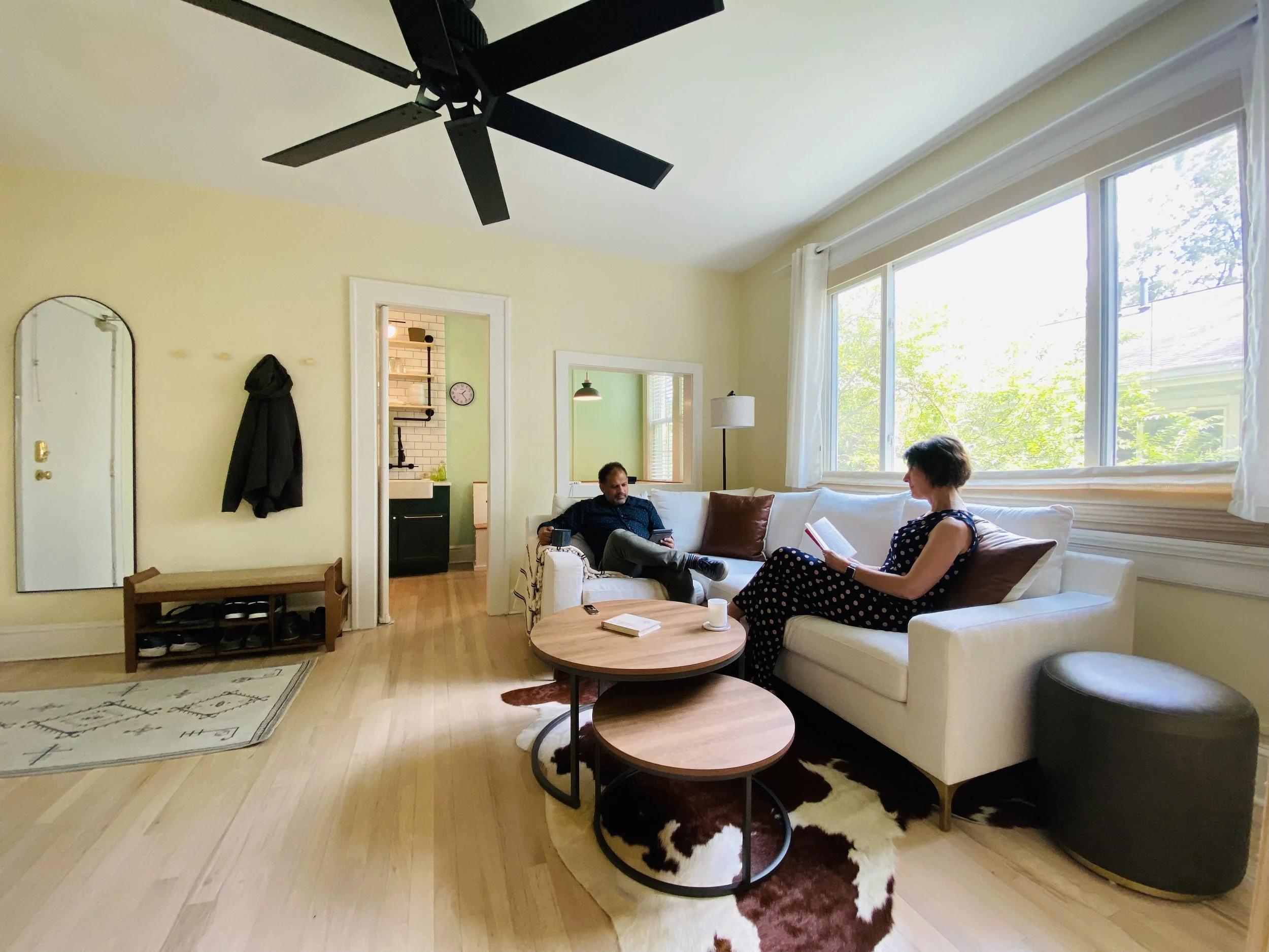 Brightening the space with the right light was key. The apartment faces east, meaning light is lost a little after midday. To begin to remedy this, I had the floors sanded and stained to be lighter and more reflective. On the red oak floors, a lighter stain blend of with a satin finish made a bright and warm, yet cool finish.
